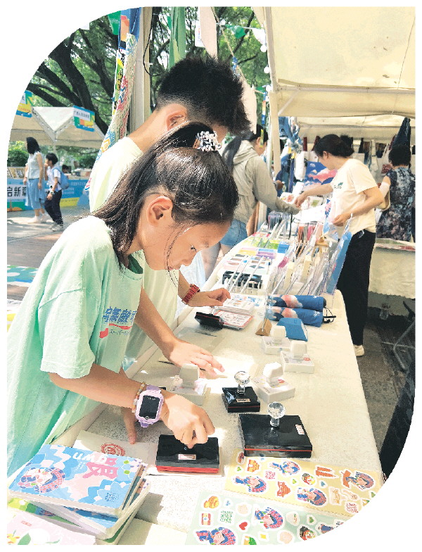 市民黄女士已经是第三年带孩子来打卡了。“今年新出了桂花形状的印章,有特色。”她10岁的女儿美吉抱着集章本,像寻宝一样在各个摊位间穿梭。在桂林酸嘢玩偶摊位前,美吉盯着盛在透明玻璃缸里可爱的辣椒造型公仔挪不开步。黄女士笑着扫码:“这种特色玩偶妈妈当年可没有。”