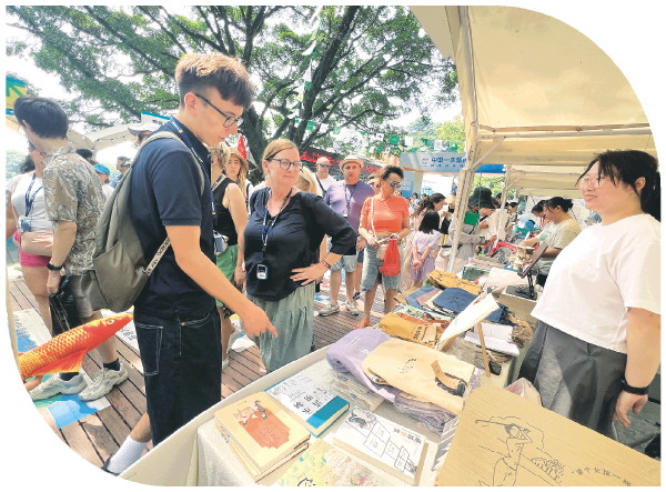 山水阅读市集吸引不少外国游客在摊位前驻足。
