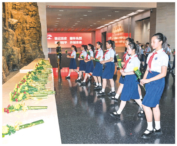 ▲7月7日,北京市第十二中学的少先队员在中国人民抗日战争纪念馆向抗战英烈献花。 新华社记者陈晔华 摄