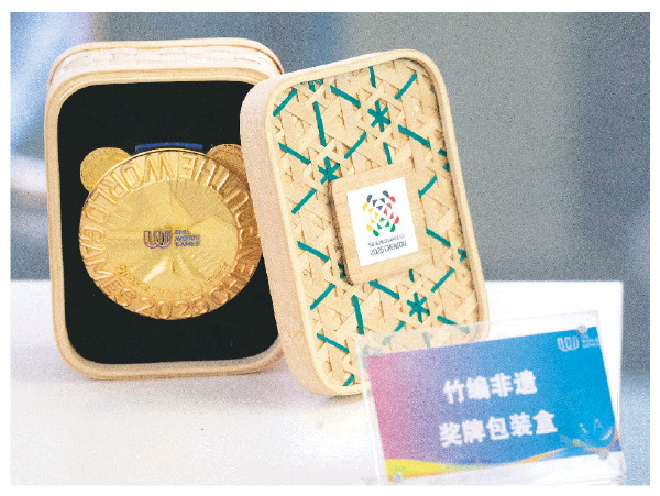 这是7月8日拍摄的成都世运会奖牌包装盒。包装盒采用非遗竹编技艺手工编织,外形“方圆周正”。新华社发(陈居伟 摄)
