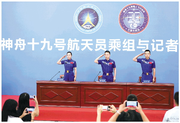 7月9日,在北京航天城,神舟十九号航天员蔡旭哲(中)、宋令东(右)、王浩泽在记者见面会上敬礼致意。新华社记者厉彦辰 摄