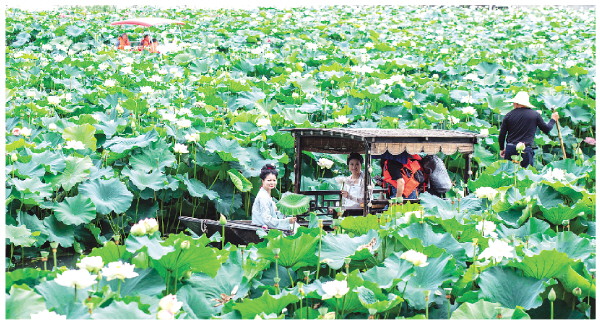7月12日,游客在湖南省娄底市娄星区青山公园泛舟赏荷。