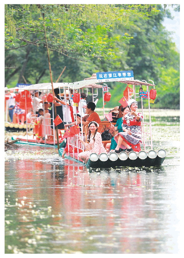 模特及市民游客乘坐竹筏在海菜花湿地河面漂流。 记者李忠波 摄
