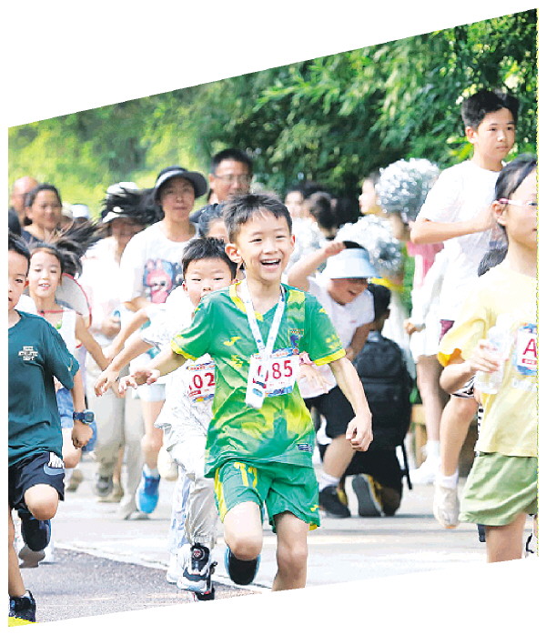 在四川省乐山市,孩子们和大人一起在健身步道跑步健身。 (新华社发)