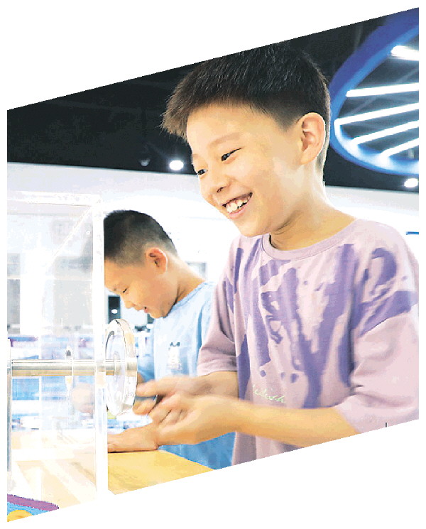 在山东省滨州市,小学生在体验科普装置。(新华社发)