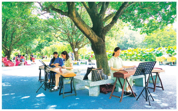 西山公园完成海绵化改造后,环境更好了。图为几位市民坐在树围上练琴。 记者徐莹波 摄