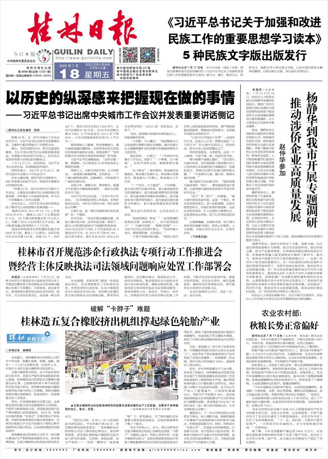 杨静华指出,桂林市坚持实干为要、创新为魂,以打造世界级旅游城市为统揽,着力优化营商环境、强化科技支撑,助力产业提质增效,在统筹高质量发展和高层次开放、积极服务和融入新发展格局中展现了新担当、新作为。桂林是中国最早对外开放的旅游城市之一,也是广西对外开放交流的重要名片,在广西打造国内国际双循环市场经营便利地背景下,发挥好桂林比较优势,推动涉侨企业高质量发展,对广西实现高质量发展和高水平对外开放具有重要意义。要深刻认识扩大高水平对外开放新形势新任务新要求,深刻把握广西战略发展机遇和独特区位优势,认真贯彻落实党中央和自治区党委关于广西加快打造国内国际双循环市场经营便利地的决策部署,依法推动广西对外开放、推动涉侨企业高质量发展,探索总结好做法好经验,为广西经济增长持续注入新活力。