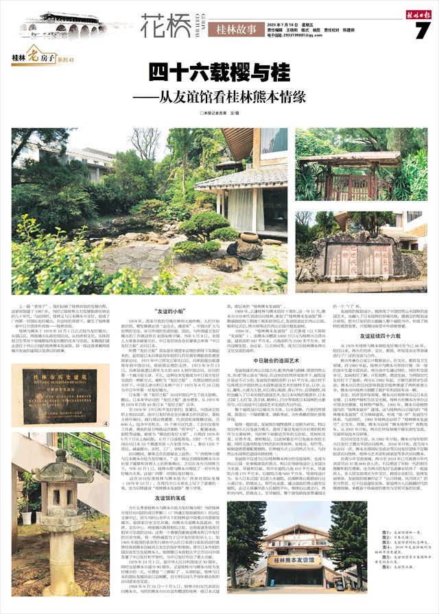 1990年,“桂林熊本友谊馆”正式落成(以下简称“友谊馆”),由熊本市赠款5800万日元与桂林市合资兴建,建筑面积947平方米,占地面积为2100多平方米。馆内设展览馆、会议室、日式房间等,成为日后桂林熊本两市文化交流的场所。