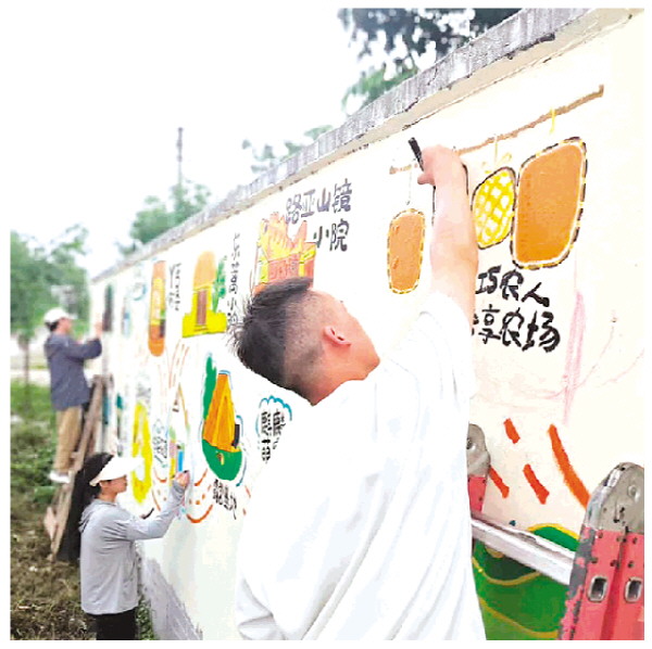 桂林航天工业学院视觉传达设计专业的同学们正在为丫吉村绘制壁画。王亚东 摄