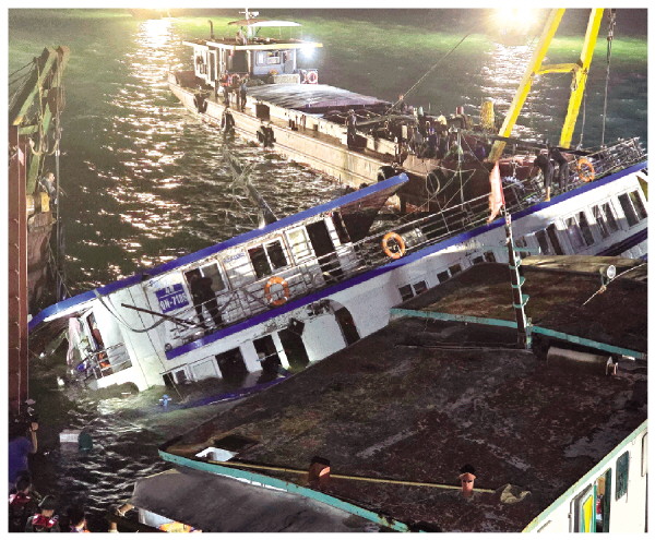7月20日,人们在越南广宁省下龙湾对倾覆游船开展救援工作。 新华社/越通社