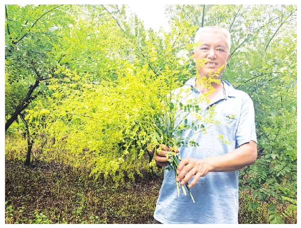 村民左光明正在采收新鲜的槐米。