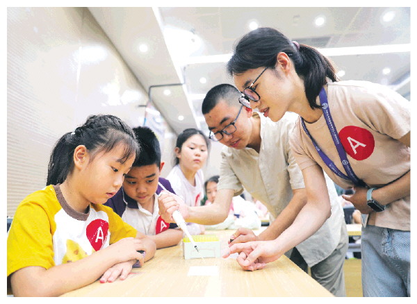 ◥7月25日,合肥综合性国家科学中心大健康研究院工作人员辅导孩子们将吸取的显色液滴加到试纸上。