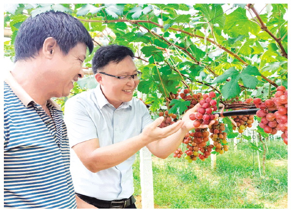 7月24日,庾志勇(右一)与种植户赵健查看妮娜皇后葡萄一季果着色情况。 记者秦丽云 摄
