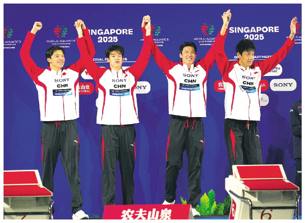 8月1日,2025年世界游泳锦标赛游泳男子4×200米自由泳接力决赛在新加坡举行,由季新杰、潘展乐、汪顺、张展硕(从左至右)组成的中国队获得亚军。 新华社记者夏一方 摄