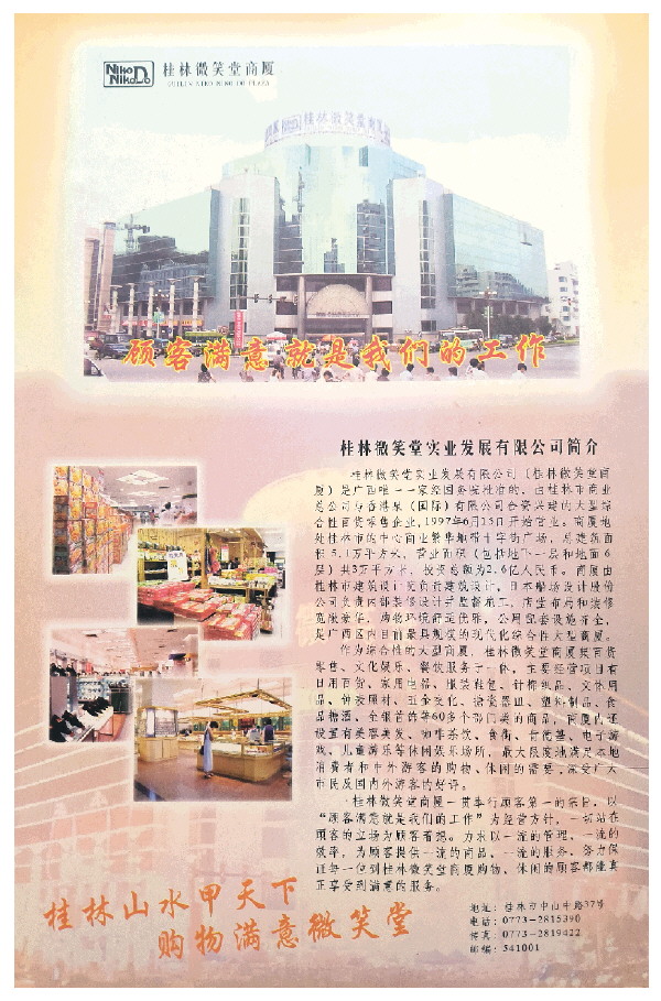 桂林微笑堂商厦于1996年得到国务院的正式批准,它是当时广西唯一一家、也是中国最早经中央批准成立的中日合资大型综合性零售企业,总投资3.6亿元人民币,注册资金400万美元。