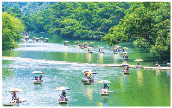 7月31日,人们在广西桂林市阳朔县遇龙河乘坐竹筏漂流(无人机照片)。