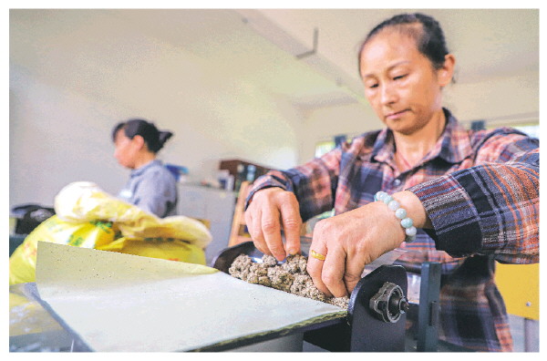 工人将晒干的艾草压实捆扎。 阳海翔 摄