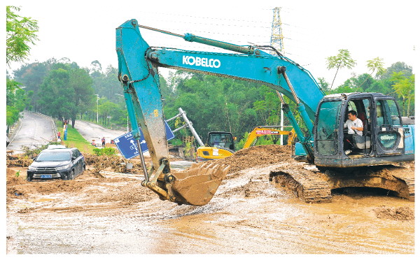 8月5日,救援机械在肇庆市端州区清理路面淤泥。