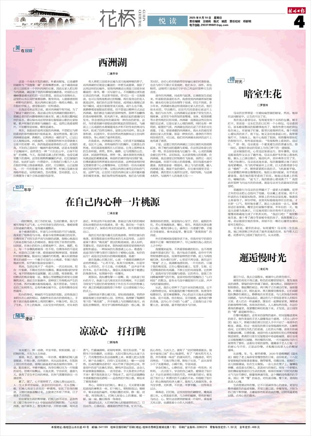 有人曾把兰田瑶乡比喻为灵川地域伸展的脖子,而西洲湖恰好就是它戴着的一串碧玉或翡翠。我除了认同这样的比喻外,觉得西洲湖还应该是兰田瑶乡深藏着的一部书,哪一页写着什么,不用翻就应该知道它表达的内涵。在这部书面前,你可以一页一页地细读,也可以笼统地粗读它的精髓。现在我身边的友人就是这样,他们站在这部书面前,或用镜头细细记录每个瞬间,或坐在船舱里谈天说地,或什么也不做,就静静观望着眼前的景致。但不管是以哪种方式亲近西洲湖,他们都会为湖泊的那种纯然、那种不加雕饰的美而啧啧称赞。阳光洒下来,湖面泛起的涟漪闪闪发光,你会感到这样的湖面有一种自由的舒放。这时,当你看到湖中游船前进时掀起的层层浪花,与湖面上三五成群的水禽展翅戏水声和不时传来的林间鸟鸣声,组成了自然交响乐,是那么悦耳动听,那么多部和谐。沉浸其中,你会自然而然地摒弃这尘世间所有烦杂,身心得到了滋养和放松。