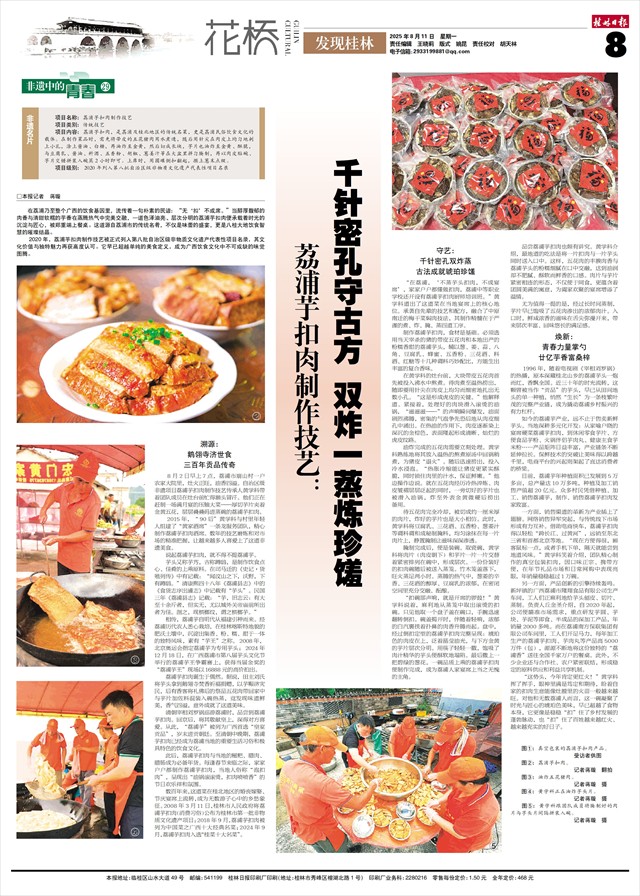 品尝荔浦芋扣肉也颇有讲究。黄学科介绍,最地道的吃法是将一片扣肉与一片芋头同时送入口中。这样,五花肉的丰腴肉香与荔浦芋头的粉糯细腻在口中交融,达到油润却不肥腻、酥软而鲜香的口感。肉片与芋片紧密相连的形态,不仅便于同食,更蕴含着团圆美满的寓意,为阖家欢聚的宴席增添了温情。