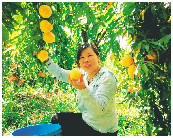 8月6日,灌阳县水车镇江塘村的果农正在采摘黄桃。 陆仕臣 摄