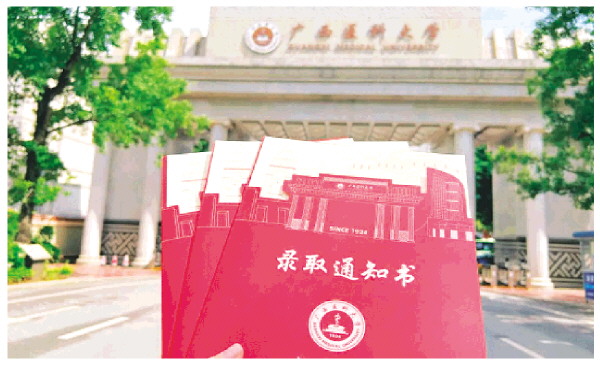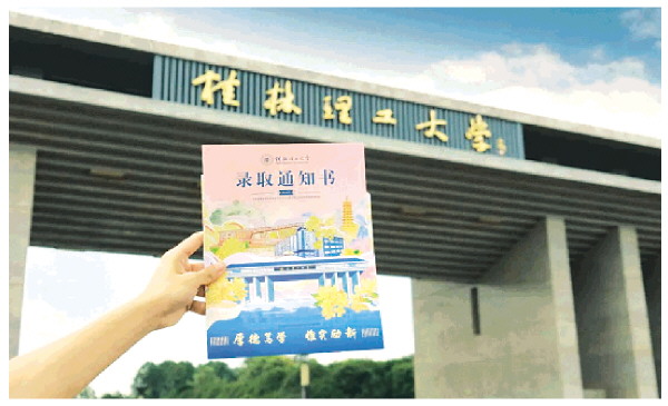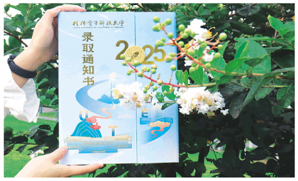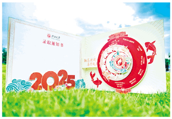 封面页以广西大学的校门为主体,朵朵浪花、接天莲叶,以及一跃而起的锦鲤,寓意突破自我、成就未来。翻开通知书内页,内嵌的“时光转盘”随之启动,指针最终定格于“欢迎2025级新生”的分区,蕴含着对新生满满的祝福和期待。
