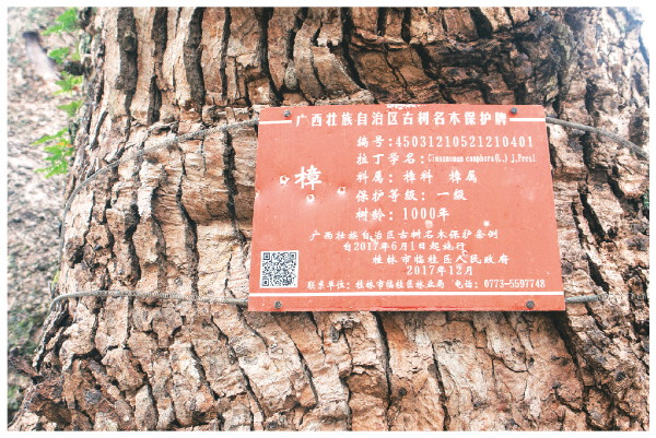 图①:红色的自治区古树名木保护牌,将隆家村的千年古樟列为一级保护。
