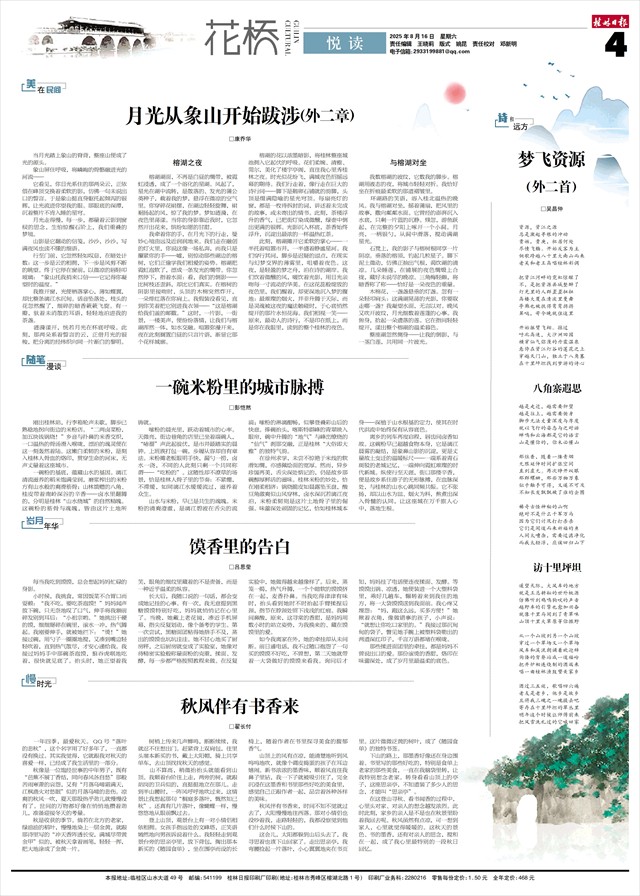 环湖路的笑语,溶入桂北温热的晚风。我与榕湖对坐,摇着蒲扇,把风里的故事,撒向粼粼水面。它曾经的澎湃沉入水底,只剩一片蓝的沉静。倏忽,游鱼跃起,在完整的夕阳上啄开一个小洞。月亮,一柄银勺,从洞中滑落,搅动满湖星光。