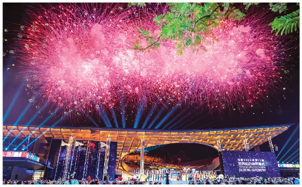 这是8月17日拍摄的闭幕式上的焰火表演。