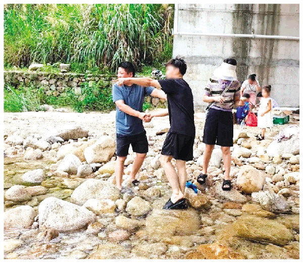 8月9日中午12时许,休假中的桂林市荔浦市公安局龙怀派出所民警蒋林辉正携家人在贺州市姑婆山景区附近停车休息。景区外桥梁下的浅滩处,不少游客在嬉水消暑。