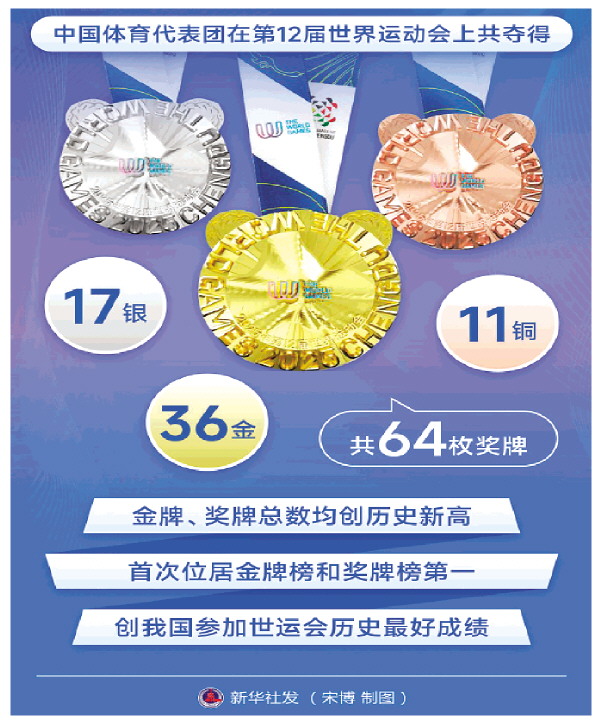新华社成都8月17日电(记者曹祎铭 张悦姗)第12届世界运动会将于17日晚在四川成都落下帷幕,这是我国大陆地区首次举办世界运动会。成都世运会中国体育代表团副团长张新介绍,中国体育代表团在本届世运会上共夺得36金、17银、11铜共64枚奖牌,金牌、奖牌总数均创历史新高,首次位居金牌榜和奖牌榜第一,创我国参加世运会历史最好成绩。