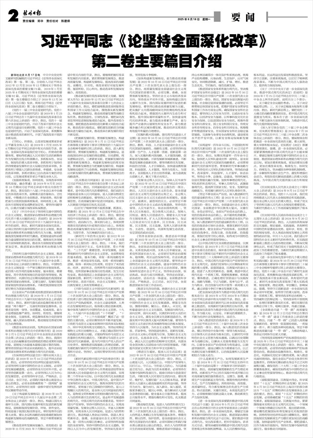 新华社北京8月17日电 中共中央党史和文献研究院编辑的习近平同志《论坚持全面深化改革》第一卷、第二卷,分别收入习近平同志2012年12月至2018年12月期间关于坚持全面深化改革的重要文稿73篇、2019年1月至2025年4月期间关于坚持全面深化改革的重要文稿92篇。习近平同志《论坚持全面深化改革》第一卷主要篇目介绍已于2018年12月30日在《人民日报》发表。现将习近平同志《论坚持全面深化改革》第二卷主要篇目介绍如下。