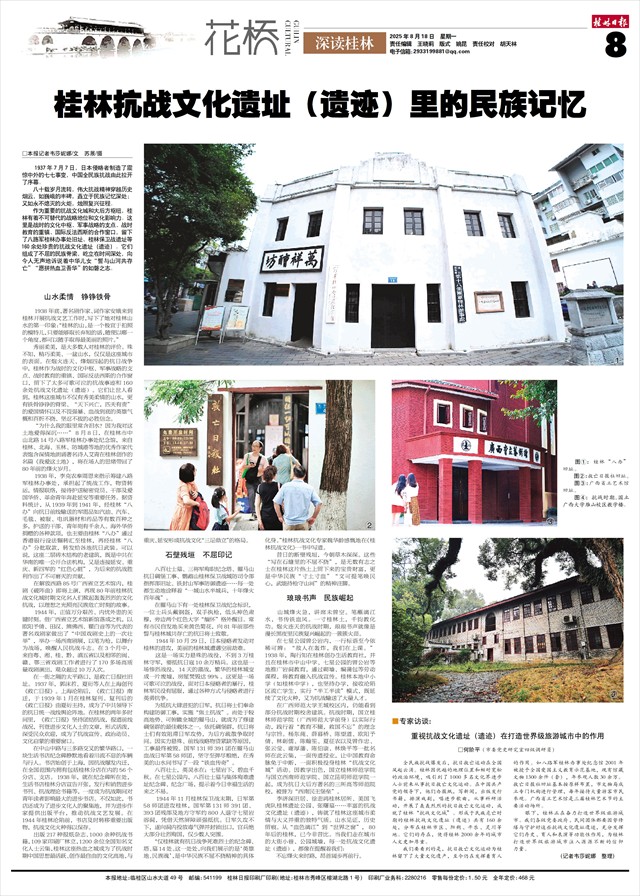 作为重要的抗战文化城和大后方枢纽,桂林有着不可替代的战略地位和文化影响力。这里是战时的文化中枢、军事战略的支点、战时教育的重镇、国际反法西斯的合作窗口,留下了八路军桂林办事处旧址、桂林保卫战遗址等160余处珍贵的抗战文化遗址(遗迹)。它们组成了不屈的民族脊梁,屹立在时间深处,向今人无声地诉说着中华儿女“誓与山河共存亡”“愿拼热血卫吾华”的如磐之志。