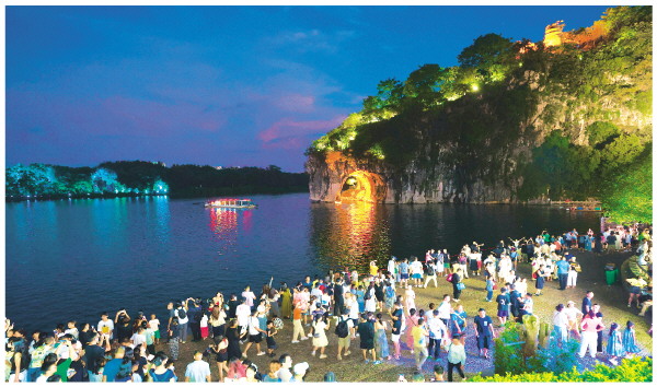 8月16日华灯初上时,桂林城徽象鼻山前,霓虹闪烁,凉风怡人,市民、游客漫步漓江边,感受夜色下浪漫的山水美景。记者李凯 摄