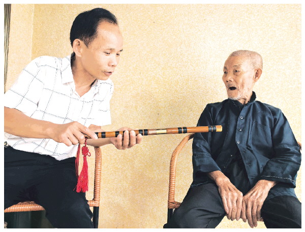 周顺祥与父亲周连发在交流吹笛子技巧,父子二人其乐融融。