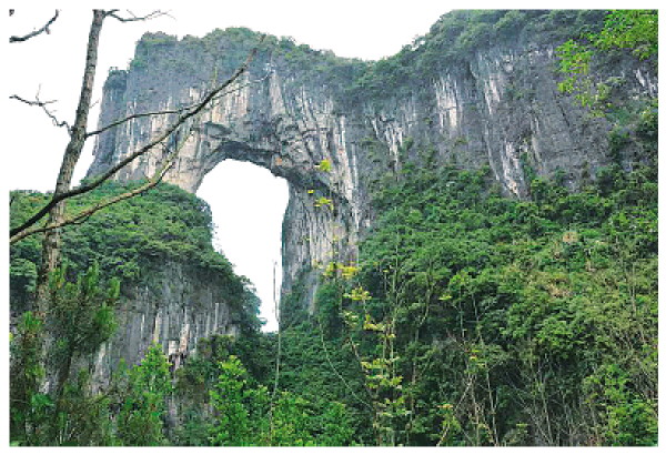 顺着山道一路摇摇晃晃地走去,转过了一个山弯,眼前猛然一亮,出现了一个宽大的山洞,这应该就是天门山天坑的入口了。只见洞口一堵用碎石叠压铺砌而成的墙壁,墙壁已经斑驳残旧,幽深与寂静让人觉得这里有点玄。一条小道通过一扇窄小的石门进入洞内。难道这里曾经有人住过?正疑惑间,女支书说,这是抗日战争时期乡亲们为躲避鬼子追杀跑进天坑内掩藏而修筑的,当年日本鬼子进山搜寻了好几天,也是徒劳无获。几十年过去,天坑庇护乡亲们,留下了传奇佳话,时至今日乡亲们也念念不忘它的好,每每提及它,都显得眉飞色舞,十分自豪。此时,顺着天坑方向,穿过那扇窄小的石门,自己就被四周的悬崖绝壁包围,如落井底。仰头望上去,井壁高耸,天似月圆。那些树木花草,长势茂密翠碧,高高地横在悬崖绝壁,态势峥嵘。没有什么力量能阻挡它们的生长,也许天坑洞开的景观与它们有关,因为它们同山一并经受风雨侵蚀,见证风云变幻,沧海桑田。