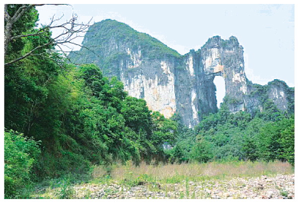 我搞不清天门所嵌的那片悬崖绝壁,无泥土粘于其上,白色的石纹平整光滑。或灰或暗的石色悬在半空,向上看去,岌岌欲倾,令人眩晕。再往远眺,天门宛如园林中的隔景之窗,隐约可见它背面的山峦连绵,绿意盎然。有人说,那片绝壁是古时仙人留下的脚掌印痕,关于天门,民间有传说,古时一个仙人为了帮助附近的老百姓填塘种地,从很远的地方挑来一担泥沙,挑到天门山之前,因草鞋中钻进了很多泥沙,撑得脚板很不舒服。于是,把担子放下,在河中洗了脚,拿着鞋往山石上打,希望把草鞋上的泥沙拍掉。哪知用力过猛,草鞋穿石而过,把山石打出了一个大洞,这个大洞就是现在的“天门”。传说终归是传说,但这足以证明,先人们曾以感恩的心,对自然风景进行了艺术想象,散发着民间文学的奇光异彩。引我入境的女支书很是心细,她生怕我们错过这里的每道景观,即便山高路远,崎岖陡峭,她都很乐意引我们过去。一路上她都很详实地向我们介绍风景的由来,和我们聊着鹅卵石,聊着天门山,聊着天坑,还聊着更远的蕉芭岩……希望通过我们的宣传,更多的人来关注潮田南圩这片尚待开发的风水宝地。