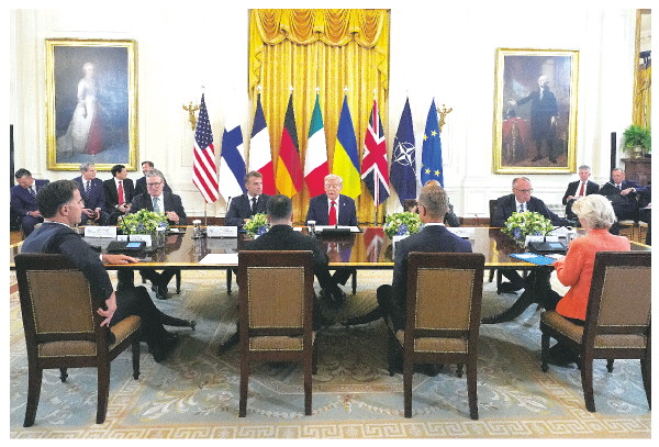 美国东部时间8月18日下午2时许,美国总统特朗普、乌克兰总统泽连斯基和多名欧洲领导人在美国白宫举行多方会晤。 新华社/美联