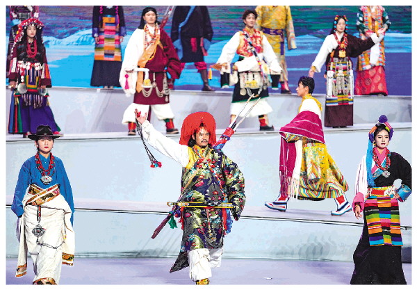 模特在首届西藏“衣脉相承”服饰文化周走秀现场展示传统服饰(2025年1月5日摄)。