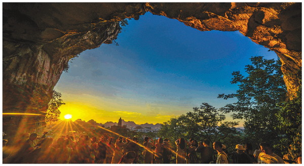在经历将近8个月清除危岩和重新改造后,穿山公园月岩于近日重新对公众开放。因岩洞穿山而过,西面洞口又是塔山落日的绝佳观赏点,月岩一经开放就受到了众多市民、游客的追捧,成为新晋网红打卡地。图为8月16日,众多游客在穿山月岩观赏落日。