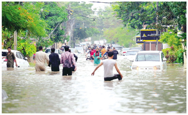 8月19日,在巴基斯坦南部港口城市卡拉奇,当地居民在暴雨过后涉水出行。