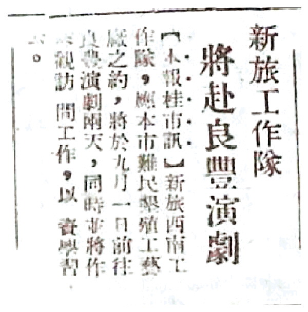 图⑤:桂林《扫荡报》1939-8-30第3版所载《新旅工作队将赴良丰演剧》消息。