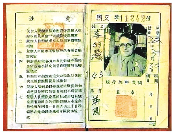 图⑥:英国剑桥大学李约瑟博士在中国时使用的证件。