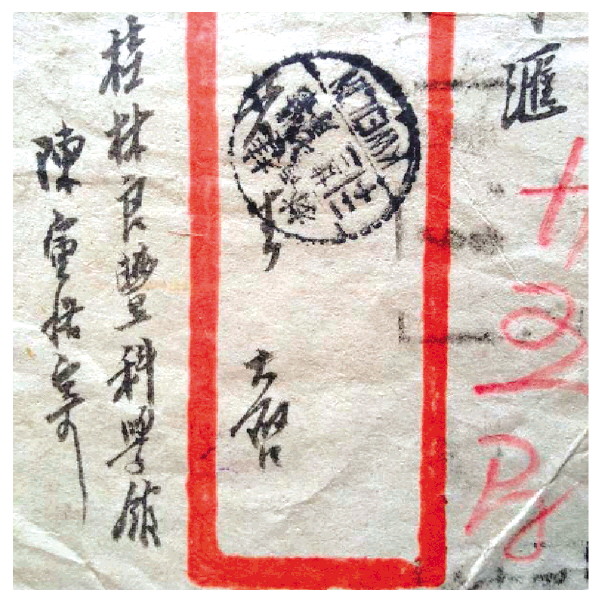 图⑦:良丰信封(局部,1942年7月陈寅恪寄自良丰,寄信地址为“桂林良丰科学馆”)