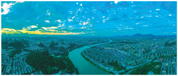 8月22日傍晚,夕阳的余晖、斑斓的云朵与华灯初上的桂林城、蜿蜒的漓江、形态各异的喀斯特峰林相映成趣,展现桂林山水自然之美。