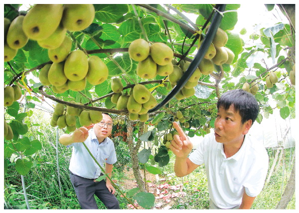 近三年来,农行广西资源县支行累计投放贷款约1100万元,支持该县中峰镇部分村民发展以优质红心猕猴桃种植为主,兼营猕猴桃采摘、雪花牛养殖、农家乐等多种经营的田园综合体,带动30多户致富带头人奔向小康生活,带动周边文旅融合发展。目前,该县猕猴桃种植面积达3000亩,产值约4600万元。图为支行员工在了解猕猴桃种植情况。 伍文悄 摄