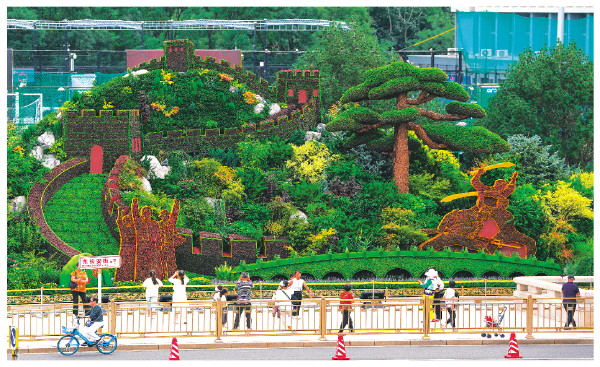 8月26日,人们在北京东单参观“众志成城”花坛。