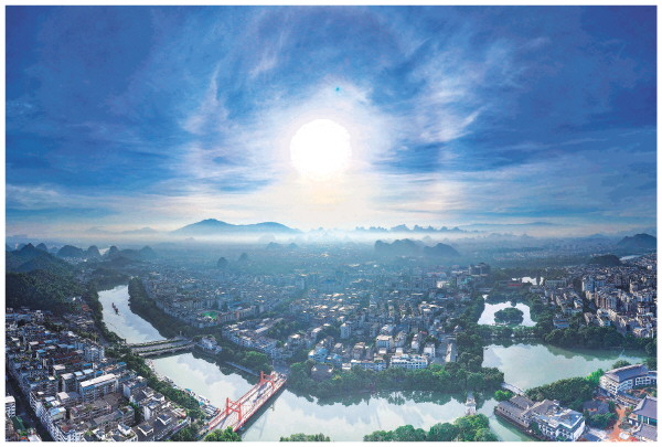 8月26日清晨,桂林城市上空出现了奇特的自然现象,太阳周围出现了一圈巨大的彩色光环,仿佛是哪吒的风火轮。这种自然现象称之为日晕,是一种大气光学现象,当阳光穿过卷层云中的冰晶时,会产生折射或反射,从而形成这一美丽的光环。