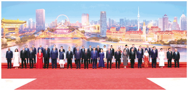 8月31日晚,国家主席习近平和夫人彭丽媛在天津梅江会展中心举行宴会,欢迎来华出席2025年上海合作组织峰会的国际贵宾。这是宴会前,习近平和彭丽媛同贵宾们集体合影留念。 新华社记者黄敬文 摄