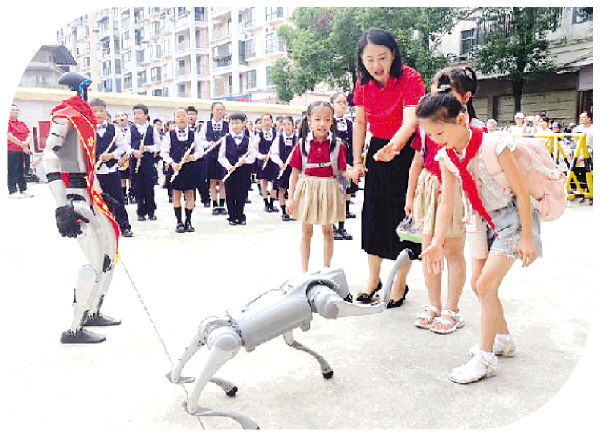 8月31日,七星区樟木小学以AI赋能教育,请来了机器人、机器狗在校门口花式迎接新生。 记者韦莎妮娜 通讯员王亚东 摄